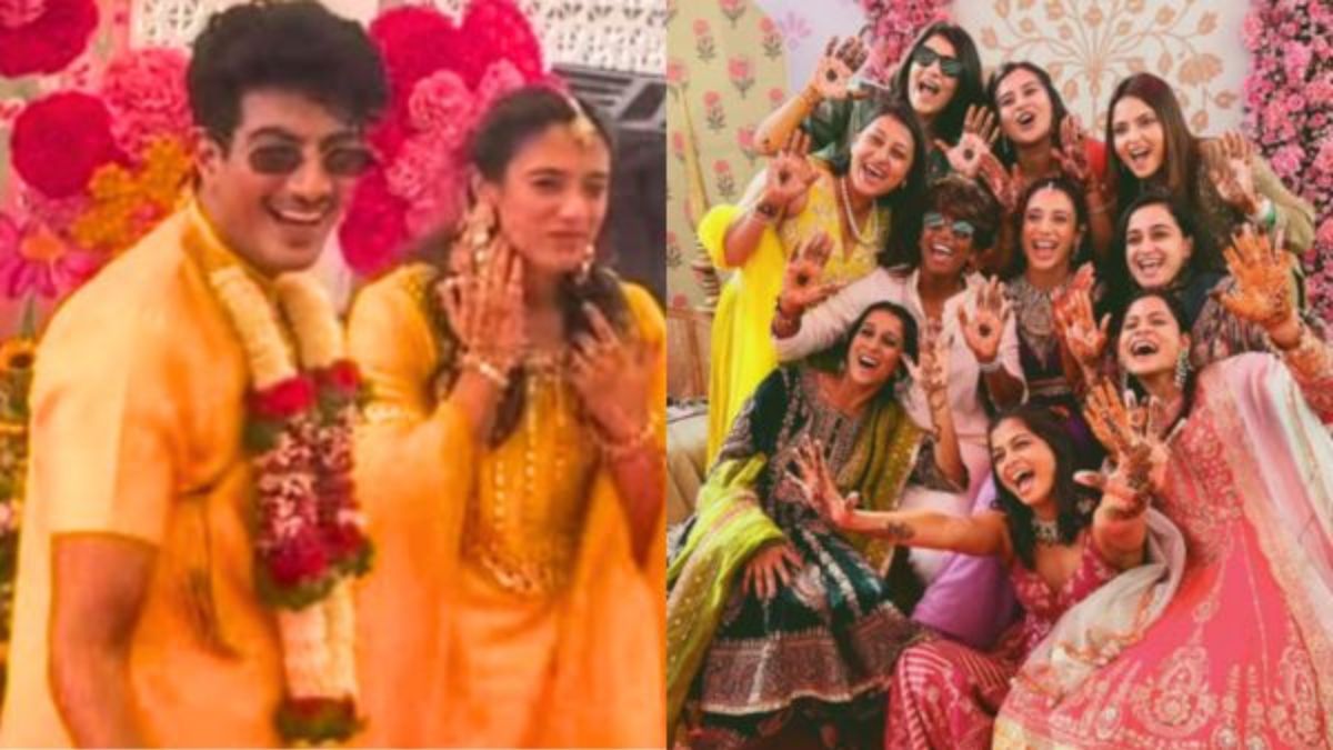 भारतीय क्रिकेटर स्मृति मंधाना और म्यूजिक डायरेक्टर पलाश मुच्छल की शादी कल होने जा रही है। बता दें कि कपल की हल्दी और मेहंदी की क्लिप सोशल मीडिया पर तेजी से वायरल हो रही हैं। जिसे देखकर दोनों के फैन्स भी बहुत एक्साइटेड हो रहे हैं। फैन्स को तो कल का बेसब्री से इंतजार है जब दोनों एक साथ सात जन्मों की कसमें लेंगे। फिलहाल तो हल्दी और मेहंदी की तस्वीरें तो सोशल मीडिया पर धूम मचा रही हैं। फैन्स इन तस्वीरों को देख जमकर प्यार बरसा रहे हैं।