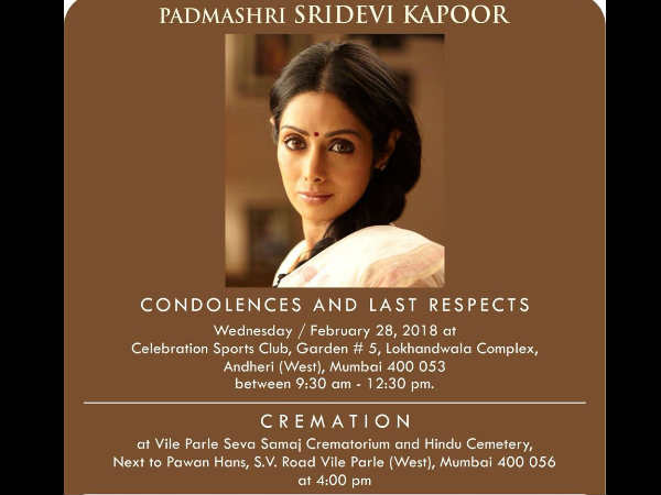 श्रीदेवी को अंतिम दर्शन के लिए कल सुबह 9.30 से 12.30 तक मुंबई के सेलिब्रेशन स्पोर्ट्स क्लब में रखा जाएगा। मीडिया बिना कैमरा के उनके अंतिम दर्शन कर सकती है।