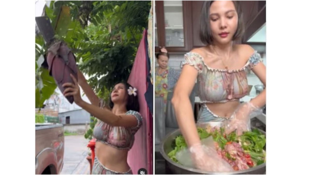 इस लड़की का नाम क्रुआ नुनुट है, जो इंस्टाग्राम पर @nut.nutcharat नाम से मौजूद है। क्रुआ अक्सर खाना बनाने का वीडियो शेयर करती हैं। इस बार उन्होंने लोगों को एक नए डिश से इंट्रोड्यूस करवाया, जिसका नाम है 'चिकन के साथ स्टीम्ड केले का फूल'। इस डिश को बनाने के लिए क्रुआ पहले केले का फूल काटती हैं और फिर पत्ता काटती हैं। इसके बाद वो मिर्च तोड़ती हैं। इन सभी का वो छोटे-छोटे टुकड़े करती हैं। फिर उसे मिक्सर ग्राइंडर में मिक्स करती हैं। फिर अन्य मसालों को चिकन में मिला देती हैं और एक साथ हाथ से मिक्स करती हैं। इसके बाद केले के पत्तों में उस मिक्चर को लपेटकर मोमोज की तरह पकाती हैं। पक जाने के बाद वो इसे लोगों को खाने के लिए देती हैं।
