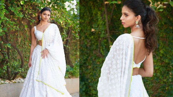 सुहाना की तस्वीरों को अपने क्लासिक सफेद चिकनकारी लहंगे में बैकलेस चोली के साथ देखा जा सकता है। इसके अलावा सुहाना ने स्टेटमेंट ईयररिंग्स और सिंपल बिंदी के साथ अपने लुक को शानदार किया।