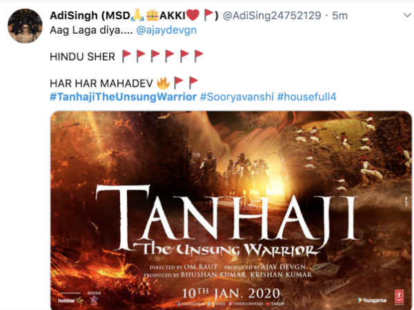 ट्विटर पर लगातार फैन्स ट्वीट पर ट्वीट कर अजय देवगन को बधाईयां दे रहे हैं। आलम ये है कि केवल 1 - 1.5 घंटे में ट्विटर पर लगभग 12 - 13 हज़ार लोग तानाजी के बारे में बात कर चुके हैं। फिल्म 10 जनवरी 2020 को रिलीज़ हो रही है। देखिए फैन्स के रिएक्शन।