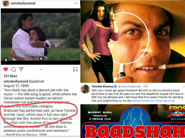 शाहरूख खान और ट्विंकल खन्ना स्टारर बादशाह की रिलीज़ को आज 20 साल पूरे हो चुके हैं। इस मौके पर ट्विंकल खन्ना ने फिल्म का एक घटिया रिव्यू शेयर किया जो हीरो के अभिनय की समीक्षा करता है और हीरोइन की नाभी और अंगों की। ट्विंकल ने ये रिव्यू शेयर करते हुए लिखा - और मुझे लगता था कि मेरी फिल्मों की तारीफ नहीं होती।