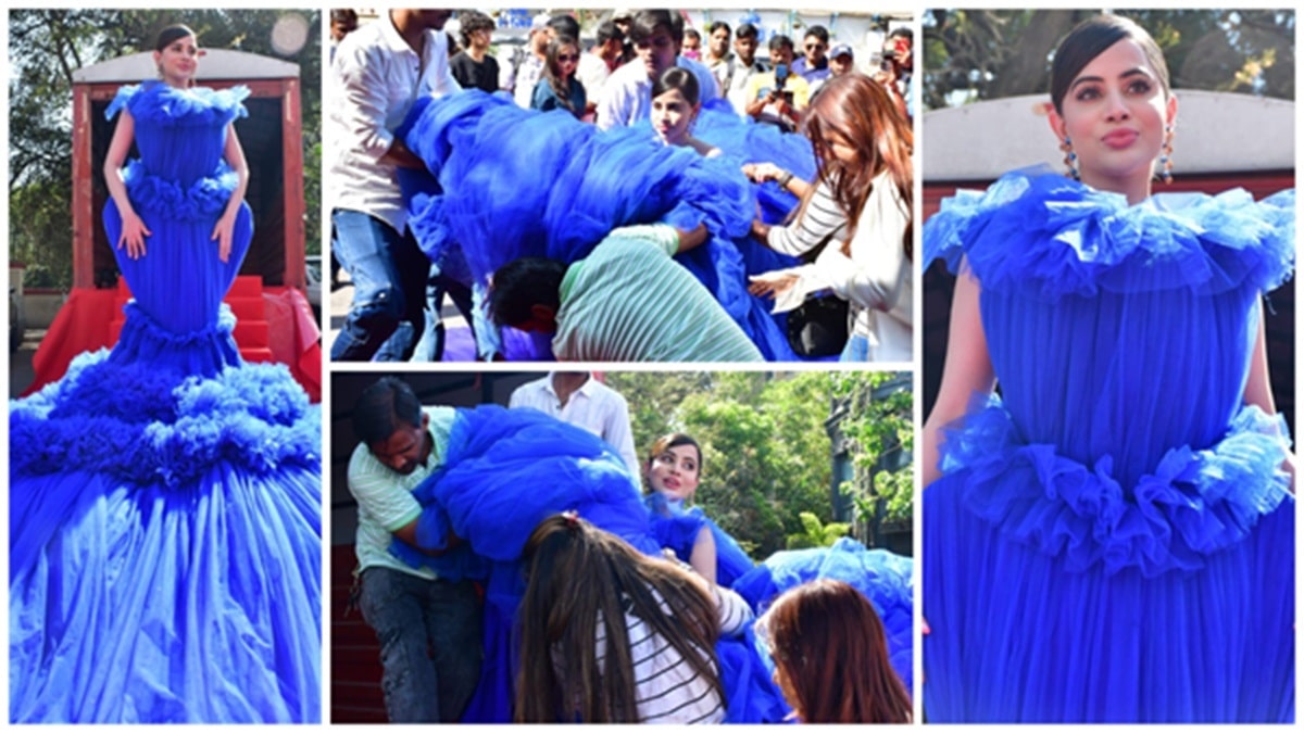 उर्फी जावेद इतने सारे नीले कपड़े की ड्रेस तैयार की है कि जैसे पूरा का पूरा आसमान या समंदर की हसीना लपेट आई है। उर्फी जावे का वीडियो सोशल मीडिया पर सामने आते ही वायरल हो गया है। मजेदार बात ये है कि ड्रेस के साथ साथ उर्फी जावेद अपना रेड कार्पेट भी अपने साथ ही लेकर आई थीं।