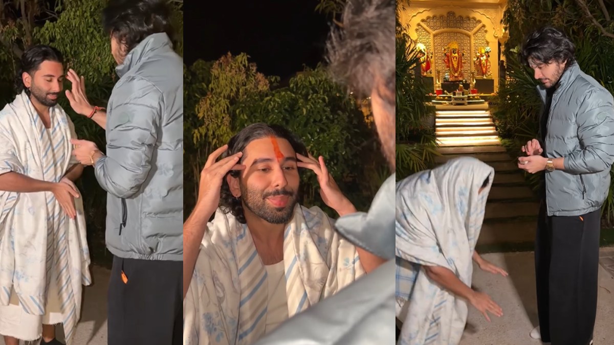 वीडियो में आप देखेंगे कि वीर ने हाथ में टीका लगाने वाला सामान लिया है और मंदिर के सामने खड़े हुए नजर आ रहे हैं। पहले वो अपने माथे पर तिलक लगाते हैं तो ओरी कहता है कि मेरे भी लगा दो। वीर पहाड़िया कहते हैं कि खुद ही लगा लो। ओरी फिर से लगाने के लिए कहता है और वीर ने तिलक लगाया तो ओरी ने छीकने की एक्टिंग की। इस दौरान ऐसा लगता है कि ओरी की मांग भर गई और वीर शांत खड़े हो जाते हैं। ओरी सिर पर पल्लू डालते हैं और वीर के पैर छूने की वाले होते हैं कि वीर थप्पड़ मार देता है। वीडियो काफी फनी है और इसको मस्ती मजाक के लिए ही बनाया गया है। ओरी ने इसको साझा किया है जिसके सामने आते ही सितारों के भी कमेंट्स आ रहे हैं।