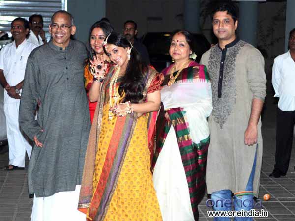 विद्या की ज्वैलरी की सबसे खास बात थी रत्न चूर। उन्होंने अपनी पांचो उंगलियों में पांच रिंग पहनी थीं और साथ ही उनसे जुड़ी हुई चेन उनकी चूड़ियों से बंधी थी। विद्या का हेयर स्टाईल भी कमाल का था। जो कि सिंपल होते हुए भी काफी खूबसूरत दिख रहा था। उनकी सेरमनी में रेखा भी शामिल हुई थीं जिन्होंने हल्के हरे रंग की साड़ी पहनी थी जिसका गुलाबी रंग का बॉर्डर था।