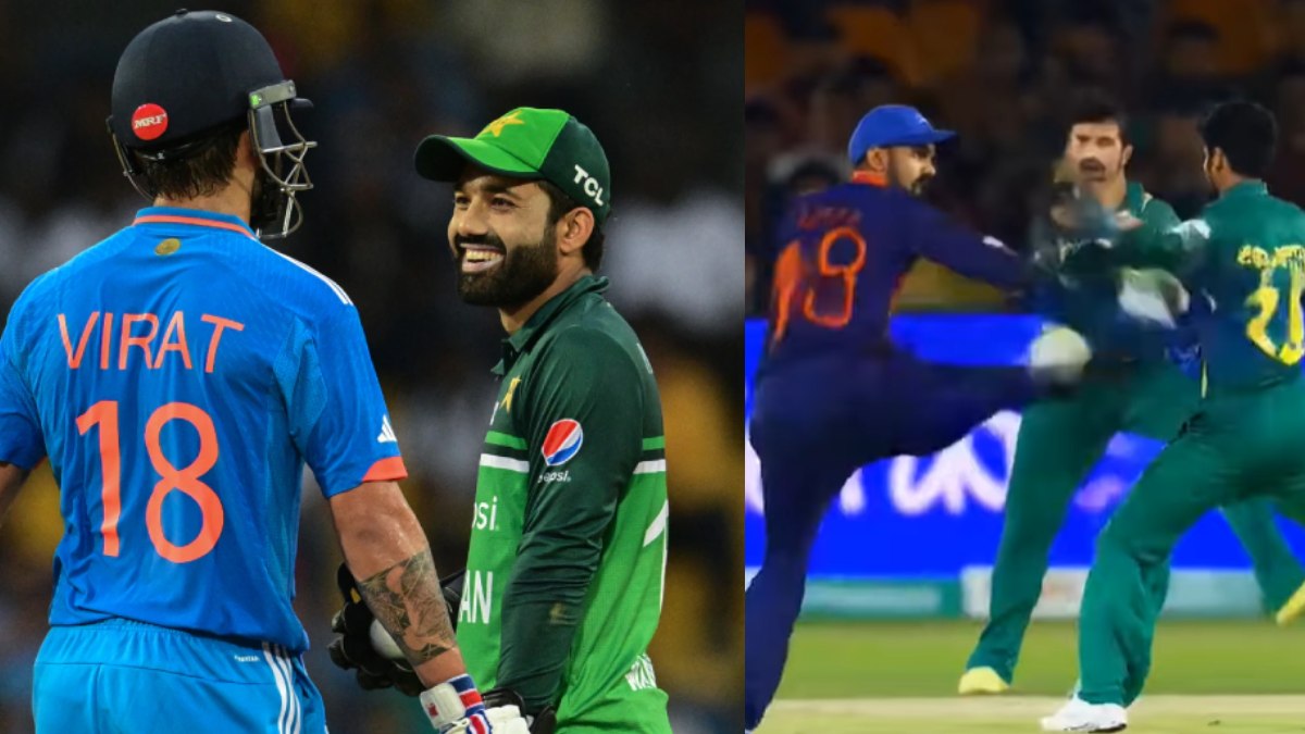 Virat Kohli Mohammad Rizwan Fight AI- अक्सर देखा जाता है कि खेल के मैदान से कई तरह के वीडियोज सामने आते हैं जो कि आपको सोचने पर मजबूर कर देते हैं। लेकिन कभी आपने खेल के मैदान पर खिलाड़ियों के बीच लात घूसे चलते देखे हैं?