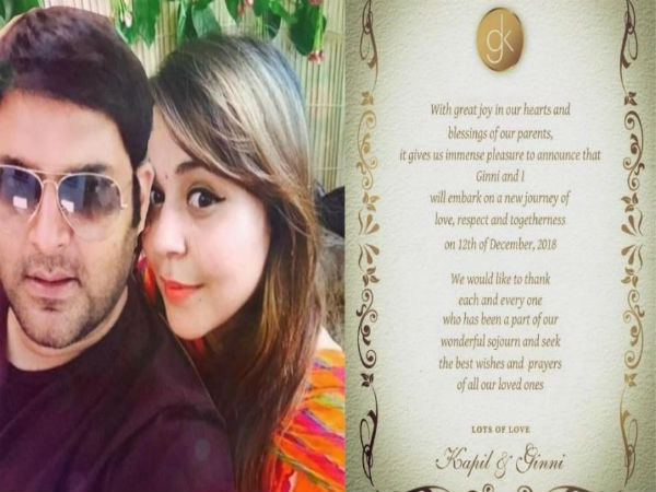 कपिल शर्मा ने इस अपने फैंस को इस बात की जानकारी एक प्यार से Marriage Invitation Card से दी है। उन्होंने अपने ट्विटर अकाउंट पर कार्ड की झलक दिखाते हुए कहा कि वह गिन्नी से 12 दिसंबर को शादी करने जा रहे हैं।