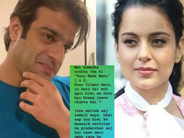 सुशांत सिंह राजपूत को जो लोग जानते नहीं थे और ना ही कभी उनसे मिले थे.. वो लोग अचानक उनको लेकर सामने आ गए हैं। इसके अलावा वो कंगना रनौत से काफी ज्यादा नाराज हैं और उनका बिना नाम लिए मानसिक रोगी तक बोल डाला है। उन्होने ये पोस्ट अपनी इंस्टाग्राम स्टोरी में डाला था। करण ने लिखा है कि.. 'मैं हमेशा सोचता था कि 'तनु वेड्स मनु' 1 और 2, दोनों फिल्मों में जो हीरो है वो अपनी बीवी से दूर क्यों भाग जाना चाहता है?