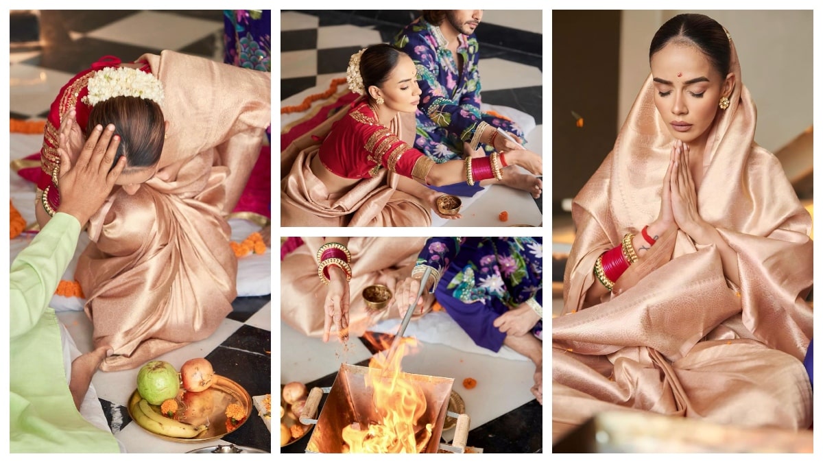 कोमल पांडे ने इन तस्वीरों को शेयर करते हुए कैप्शन में बताया कि घर बनाने की उनकी यात्रा आसान नहीं रही। फिर भी दोनों ने इस पल का खूब आनंद लिया। इस खास मौके पर कोमल ने गुलाबी गोल्डन कलर की रेशम की साड़ी पहनी हुई थी। जिसमें वह काफी सुंदर लग रही थी। इस पर सुनहरे जारी का काम हो रखा था और लाल रंग के ब्लाउज के साथ उन्होंने इसे पेयर किया हुआ था।