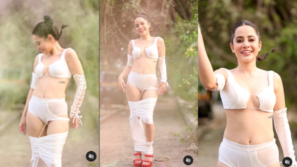 इस दौरान उर्फी जावेद सफेद कलर के बोल्ड और डेयरिंग कट्स वालों अतरंगी कपड़ो में नजर आ रही हैं। इसके साथ ही उर्फी ने काफी फनी सा हेयरस्टाइल भी बनाया हुआ है। उर्फी का ये होली लुक फैंस को काफी पसंद आ रहा है।