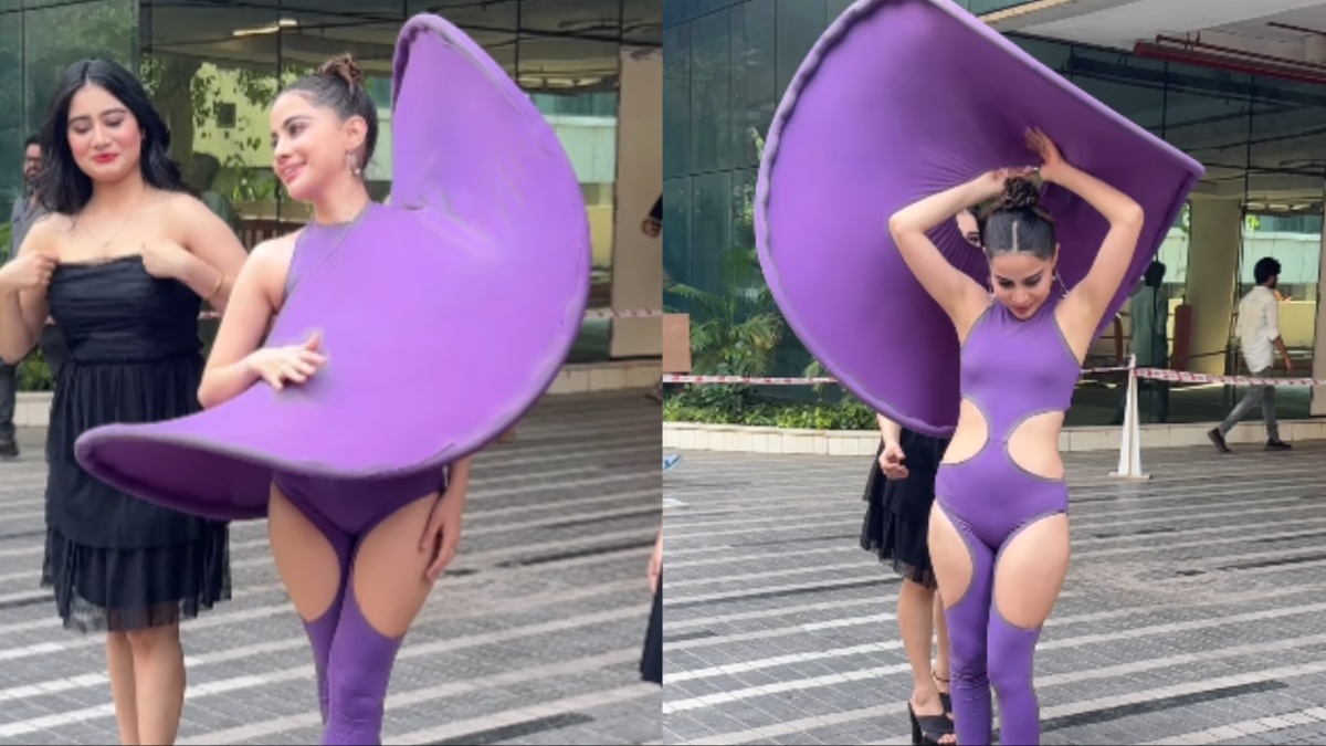 उर्फी जावेद को हाल ही में एक पर्पल आउटफिट में स्पॉट किया गया। इस आउटफिट में उनका लुक हमेशा की तरह थोड़ा अलग और अजीब था। उन्हें देखकर ऐसा लग रहा है जैसे वो कोई खिलौना पहन आईं हो। उनका लुक काफी अलग लग रहा है। साथ ही उनके मूव करने पर ये ड्रेस फैन की तरह घूमती नजर आ रही है। हालांकि, वो पैपराजी के सामने अपनी ड्रेस का सबसे जरूरी पार्ट निकालकर भी दिखती हैं।