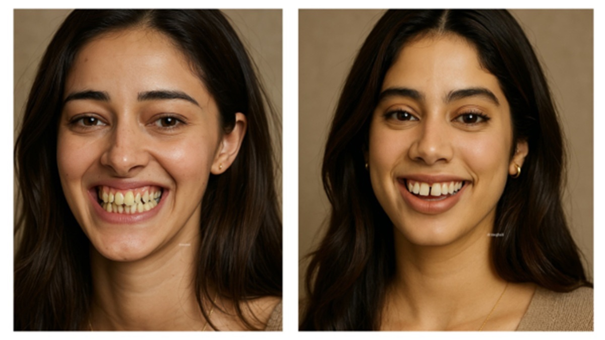 इन तस्वीरों में जान्हवी कपूर, अनन्या पांडे, सुहाना खान, ख़ुशी कपूर और आलिया भट्ट को देखा जा सकता है। इन तस्वीरों के दौरान यह सभी हसीनाएं काफी ज्यादा अलग दिखाई दे रही हैं क्योंकि इनके दांतों में कुछ ना कुछ डिफेक्ट देखा जा सकता है। जिसके चलते इनका लुक ही अलग देखने के लिए मिल रहा है। हालांकि यह सभी तस्वीरें पूरी तरीके से फेक है और इनको सिर्फ और सिर्फ इमेजिनेशन के आधार पर AI द्वारा बनाया गया है।