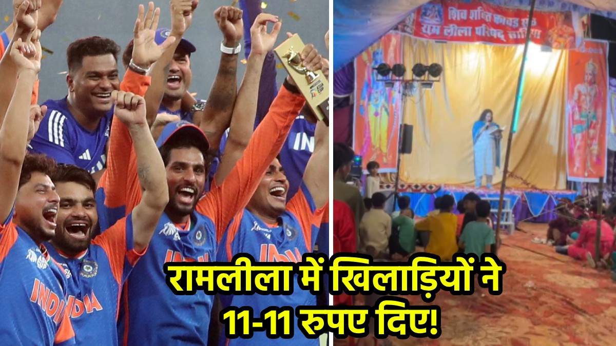 ये वीडियो एक रामलीला का है जिसमें एक महिला मंच से इनाम का ऐलान कर रही है। ऐसा लग रहा है कि मैच जीतने के बाद टीम इंडिया के सारे खिलाड़ी सीधा रामलीला देखने के लिए पहुंच गए हैं।