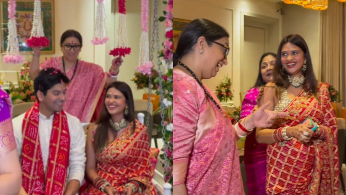 सोशल मीडिया पर सामने आए एक वीडियो में स्मृति ईरानी कवि कुमार विश्वास की बेटी अग्रता शर्मा के ससुराल तीज मनाने पहुंचती दिखीं। अग्रता की पवित्र खंडेलवाल से शादी के बाद यह उनकी पहली तीज थी। इस खास मौके पर स्मृति गुलाबी साड़ी में बेहद खूबसूरत लग रही थीं। वीडियो में वे फूलों से सजे झूले पर बैठे नए जोड़े पर फूल बरसाती हुई दिखीं।